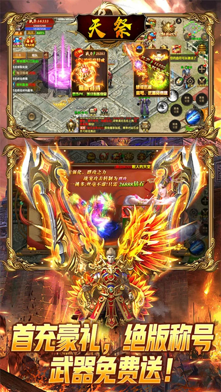 一款全新的单职业动作冒险类传奇游戏!主要以升级、爆装备、攻沙、跨服远征为核心,丰富多样的玩法,华丽炫酷的时装特效,高清画质极致视觉盛宴。击杀BOSS可触发超级幸运红包大爆,免费直升满级VIP,闯关专属地图爆守护神装。还有每日跨服屠魔免费抽神壕套装!超高怪物爆率,元宝神器战装爆满屏,让你轻松刷怪,惊喜不断。怪物攻城、阵营战、沙城争霸、跨服远征、福利转盘、幸运翻牌等线上活动精彩不断。更有冠名专属、定制称号助你叱咤风云,威名远扬!战宠神威,唯吾独尊!热血狂爆,一战封神!