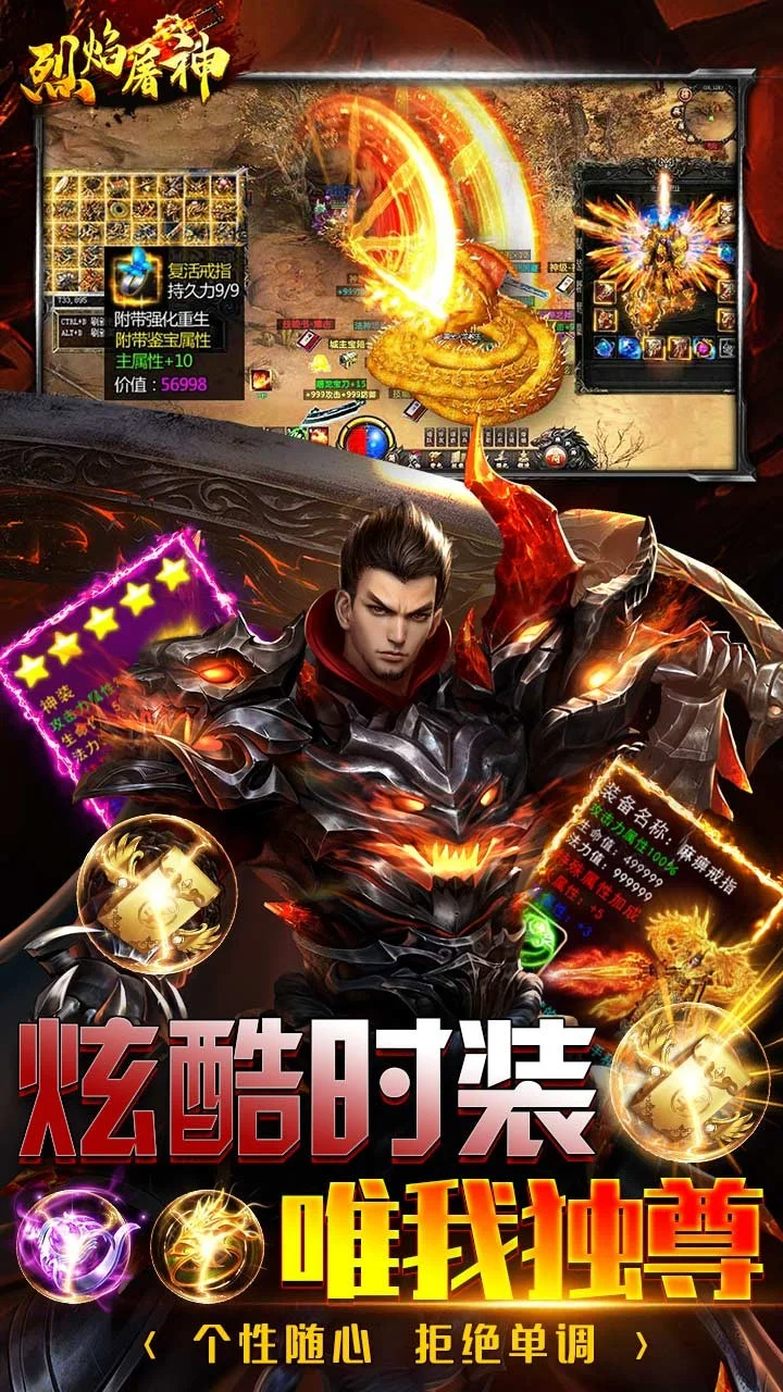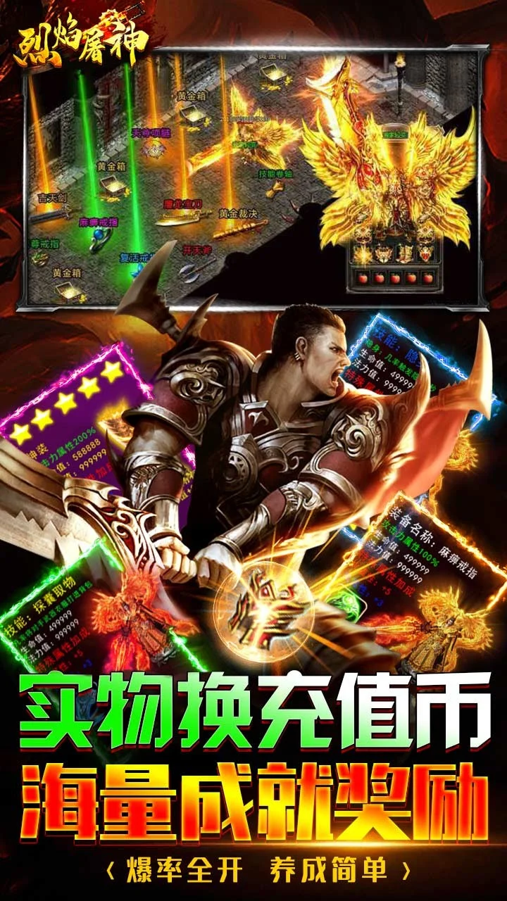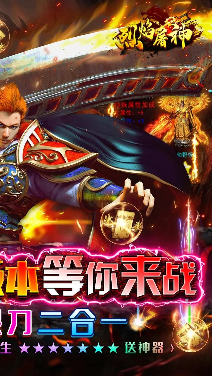 《烈焰屠神》(火龙无限刀)火龙版本融入无限刀元素,一秒十刀给你从未有过的体验,创角送切割、送神器、送直达四转丹,打怪掉落实物,可以回收海量充值币,游戏内成就还可以获得海量材料,散人天堂!!!
