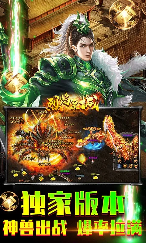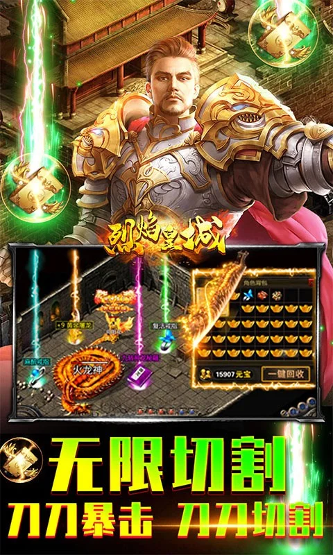 烈焰皇城(神兽无限刀)是款全新神兽版本的复古传奇,一人一刀一宠,上线送专属装备!所有装备货币均可掉落!散人打金好去处!上百张地图精彩纷呈,各种传奇复古的传奇元素统统都能体验!超高爆率,酷炫羽翼,前所未有的玩法体验,快邀请你的兄弟征战沙场吧!