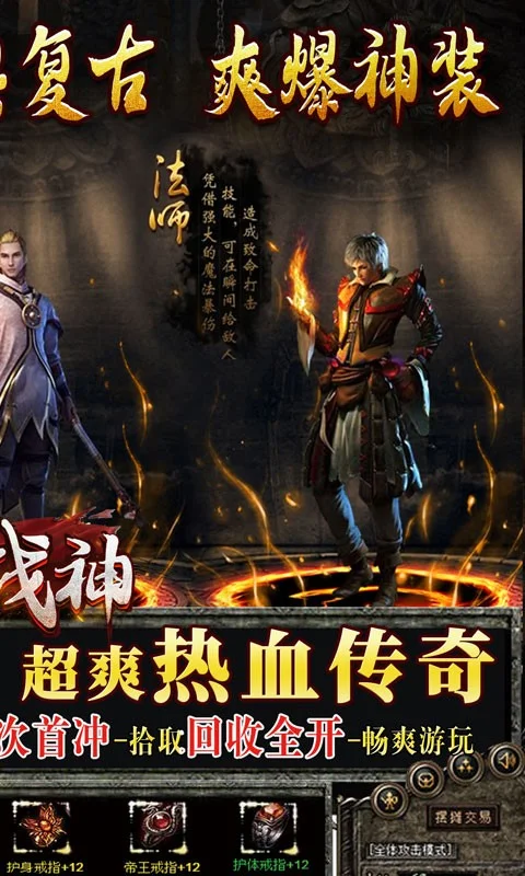 三职业复古传奇游戏、游戏为复古传奇风格,在原有的复古传奇系统上,新增了鞭尸符,实物兑换,全民福利等平民特色系列,每个大陆有特殊装备合成系统,西游,玄幻等特殊系统地图,上线更有超强福利500真实人民币充值卡,只为您重温经典,再现复古传奇!