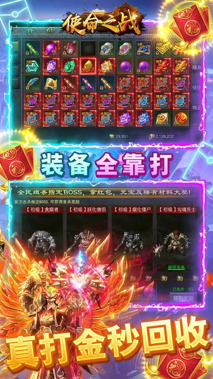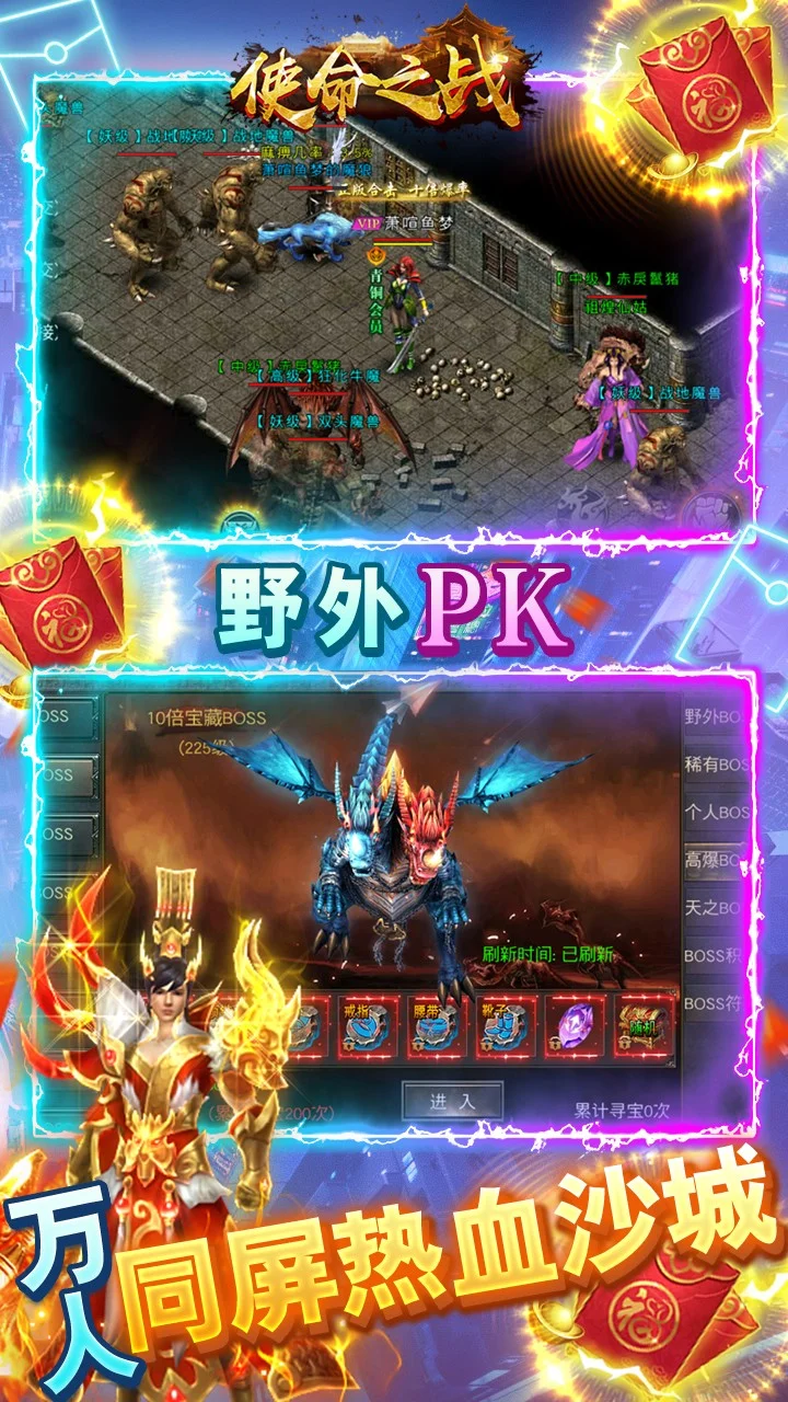 这是一款“装备靠打”全新传奇模式游戏,花钱砸装备的时代已终结,让玩家们找到当年痛快刷装备的快感。无论在战法道三大传统职业、各职业专属炫酷技能,还是在游戏玩法、操作界面上,都原汁原味呈现了经典传奇风格,畅爽PK。杀人爆装,多人同屏! 兄弟百人,同仇敌忾!
