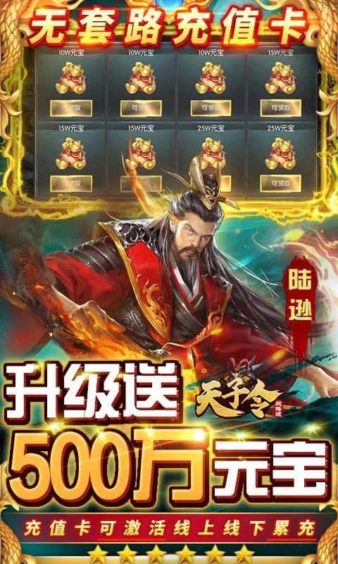 《天子令(无限打金版)》是2022年最三国的三国策略卡牌手游,给玩家还原最真实的三国武将,体验最真实的三国。上线就送贵宾10,升级还能领500万元宝,还有多重福利助力玩家一统天下。而在游戏中,你将置身于三国战场,发展势力,招募良将,和盟友一起争夺洛阳!不需要担心土豪大佬碾压全服,游戏内剿灭土匪充值卡无限爆、资源无限打,充值卡可激活所有累充类型的线上线下活动。杜绝“鬼服”“村服”,游戏中的赛季制“天下布武”玩法让玩家不再孤单。策划承诺,将虚心听取玩家意见,游戏版本内容持续更新!力求为玩家打造一款福利真实,有趣耐玩的三国策略卡牌手游!
