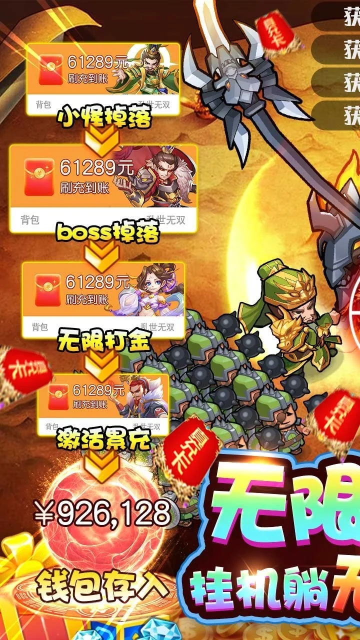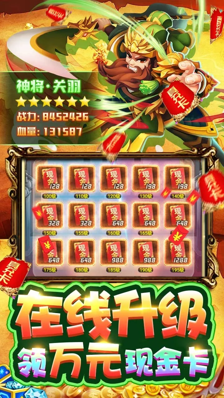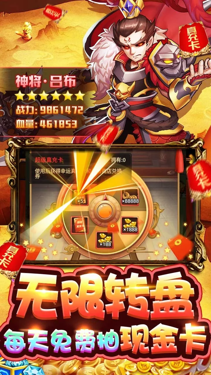 2022年首选三国策略卡牌手游,国手级原画师打造高精度三国题材策略卡牌游戏;致敬热血经典三国世界,一级高端影视特效,暴爽画面冲击感,畅享扣人心弦的极致对战体验,勾起你不羁的三国情怀。游戏最新版强势出击,福利爆炸爽翻天。开局就领超多红神将,游戏每天上线挂机就躺拿大量真充红包,无限抽奖转盘、BUG转盘,GM商城全部都是免费领,不怕福利送的多,只怕你领到手软!
