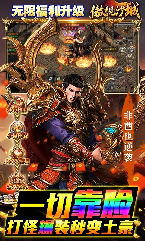 《傲视沙城(科技无限刀)》是一款新科技版复古三职业传奇手游。沿用了经典的传奇登录界面,完美复现了战士、法师和道士三大职业风云际会。快来和兄弟一起热血攻城,奋战到底,重铸属于你们的热血霸业!战士近战格斗,法师群体攻击,道士召唤神兽。打怪掉宝、活动产宝、职业技能,自由PK。