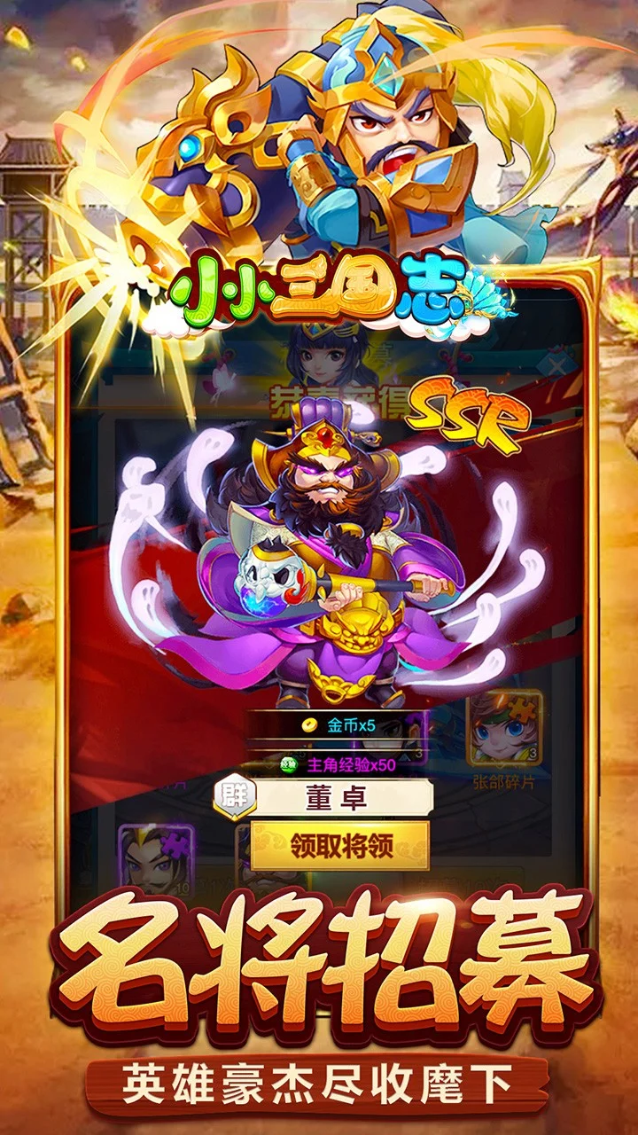 《小小三国志(定制送千抽)》是一款纯正三国策略卡牌手游,挂机升级打BOSS,24小时战不停!Q萌可爱的三国武将,诙谐幽默的NPC,还原真实历史的主线剧情,让各位少年主公在轻松搞笑的画风中体验到三国时期群雄争霸的战斗快感!貂蝉、吕布、甄姬…众多历史名将正在等待您的招募,赶紧来玩吧!
