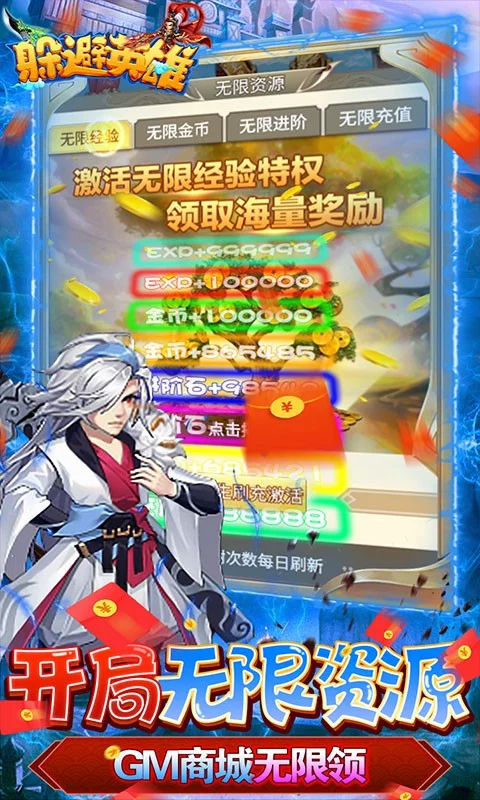 《躲避英雄(GM科技刷充)》是一款三国挂机卡牌游戏,GM刷充现金券!刷满红神将! 全新版本福利来袭:开局赠送GM1特权,免费送万充现金劵!游戏内更有大量【现金券】等着玩家使用,可代替RMB进行礼包的购买和充值,登录送千百张高级纳贤令;天天签到送武将;打造前所未有的战斗回合体验,人气大作轻松上手,战马飞驰、三国名将,让你体验全新刺激的三国之旅!
