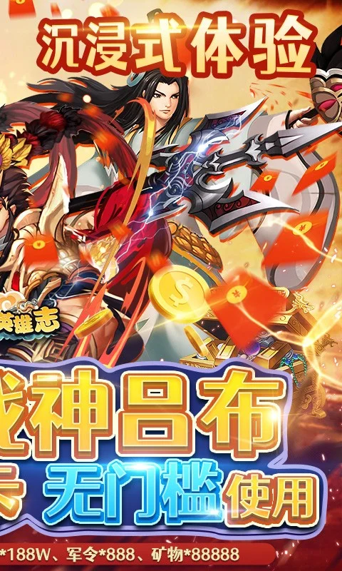 《三国英雄志》是一款三国题材经典卡牌手游,集合三国各大名将,高还原度场景,让你身临其境感受真三国动作卡牌。 各种技能组合、大招秒杀,体验前所未有打击快感;各个阵营武将培养有不同玩法,多种日常竞技挑战等。上线送海量福利 V10特权,首日可令三国战神吕布助你通关刷本无压力,游戏内0氪万元充值,通关再送充值卡,体验土豪的快乐,赶紧来做一回三国最强君主吧!