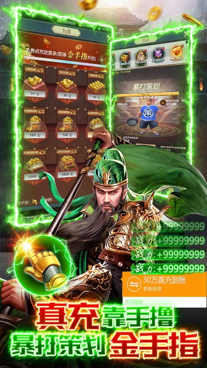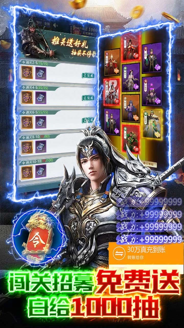 游戏简介:《诸葛无双送GM万充》是一款极具策略性的放置卡牌游戏,单身10年策划,真人还原入驻,为手速党精心策划5秒真男人福利玩法!暴打策划获得金手指道具,免费充值点到手软!闯关,挂机均可获得大量充值卡碎片,不花钱免费合成千元真充卡!多日累充!每日累充!VIP!统统免费激活,活动免费白嫖!游戏还原经典三国场景以及数十个史诗级武将收集,全方位自由培养,阵容搭配千变万化,合击技酷炫炸裂,十八般神兵齐出制胜全场,助力主公称霸天下,一统三国!新奇与经典完美融合,延续魏蜀吴群的传奇对决!