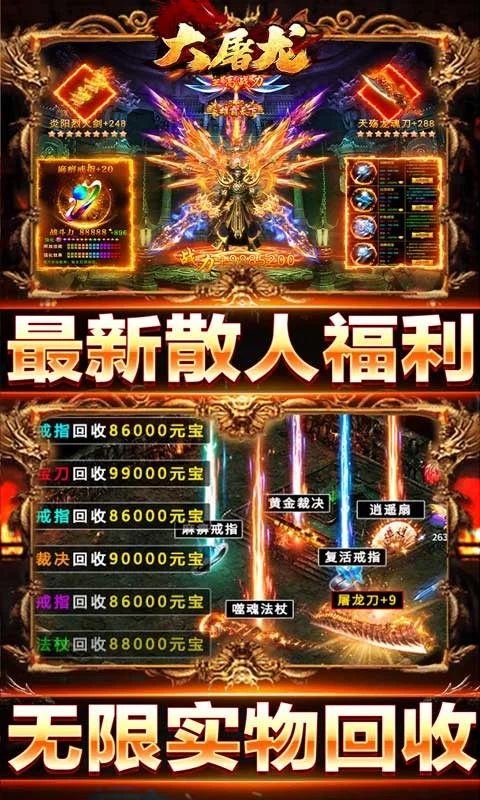 大屠龙(爆充光速神器),无限实物回收,自动回收上线送,大把福利等着你!上线更有上万爆率,上万切割等着你,一秒十刀,光柱满地,只为良心代言!兄弟齐心,准点攻沙,一起拿终极奖励!不要犹豫,赶紧加入吧!