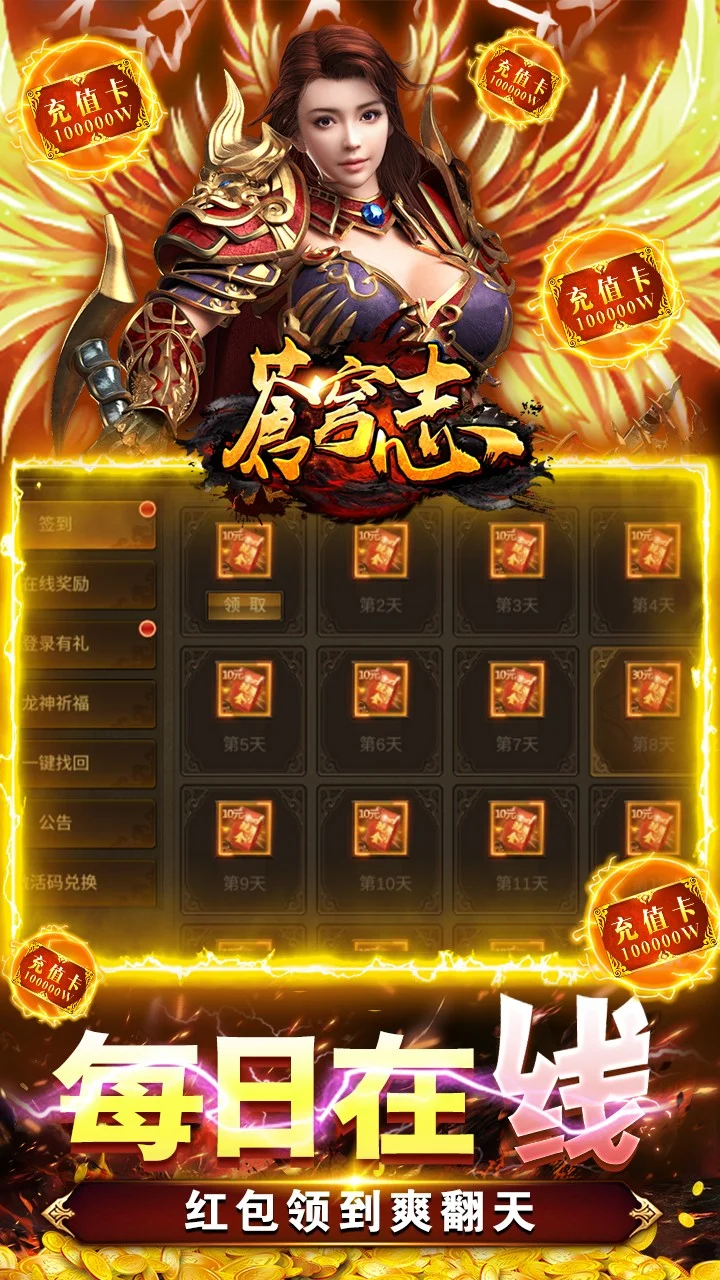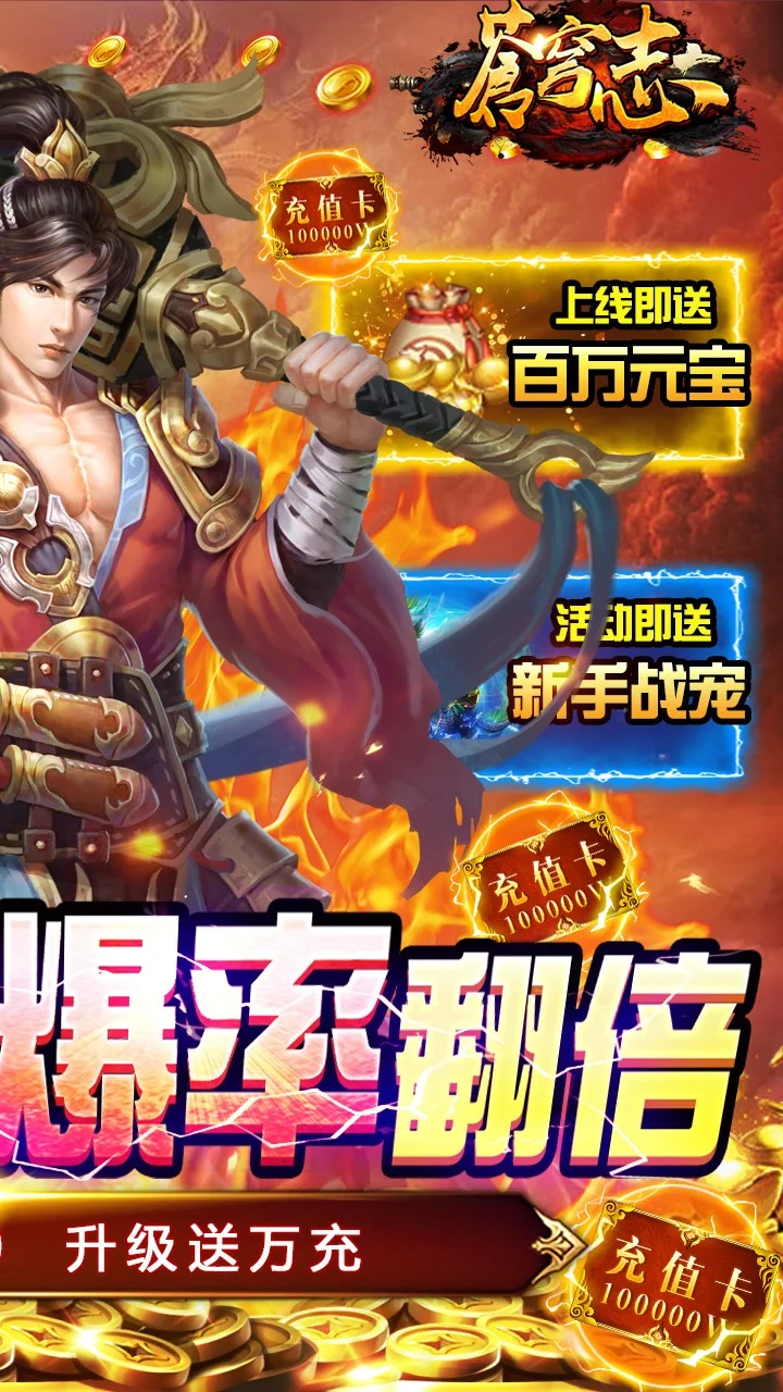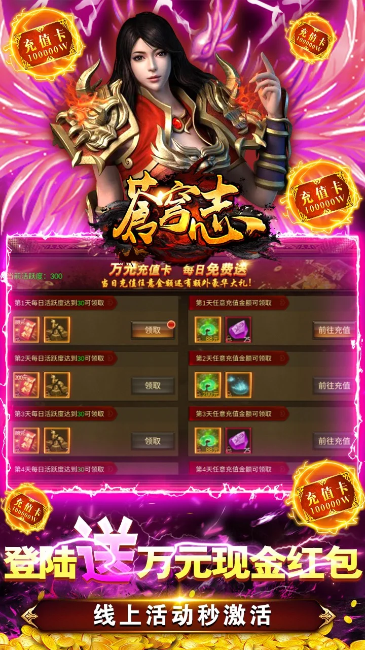 这是一款复刻电脑端传奇经典玩法,加入深度改版的传奇题材手游。登陆即送VIP7,连等7天领5000次寻宝最高出终极,首充礼包免费送,领全职业通用黄金裁决、满阶天狼,升级可领万元充值卡,每日抢5W元宝红包,天天登陆领真充领时装,三职业修正平衡,高智能挂机刷怪,小怪掉终极装备,全地图开服红名PK,每周一三五8点激情攻沙,不充值也能爽玩一整年。