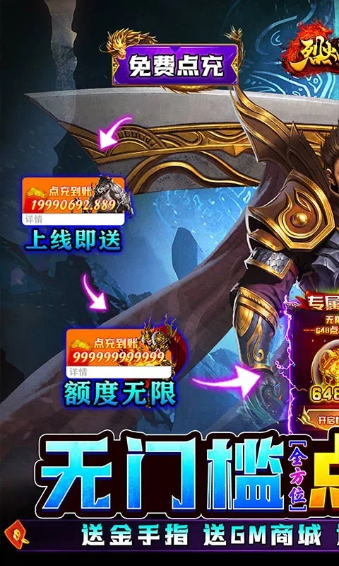 烈火战神(GM点充科技)重磅归来!全新单职业挂机H5传奇动作手游!创角登录送888万元宝,1亿金币、绝版称号!全新免费直充工具,无限点充648!首冲!累充!vip!统统免费激活!挂机打boss狂送充值卡,华丽时装,强力魔将在线即得!战法道三大职业风格迥异,技能酷炫秀翻天!快来征战你的传奇之路吧!