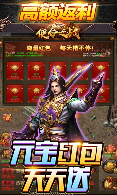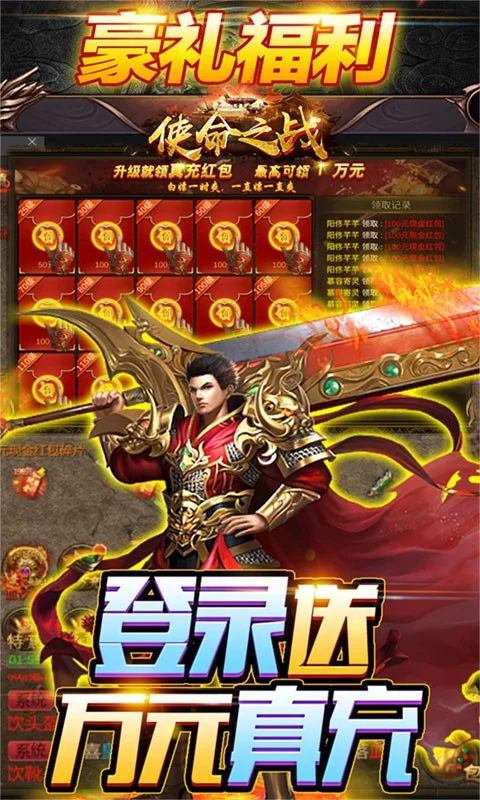 这是一款复刻电脑端传奇经典玩法,加入深度改版的传奇题材手游。登陆即送VIP7,连续登录7天领5000次寻宝最高出终极,首充礼包免费送,领全职业通用黄金裁决、满阶天狼,升级可领万元充值卡,每日抢5W元宝红包,天天登陆领真充领时装,三职业修正平衡,高智能挂机刷怪,小怪掉终极装备,全地图开服红名PK,没周一三五8点激情攻沙,不充值也能爽玩一整年。