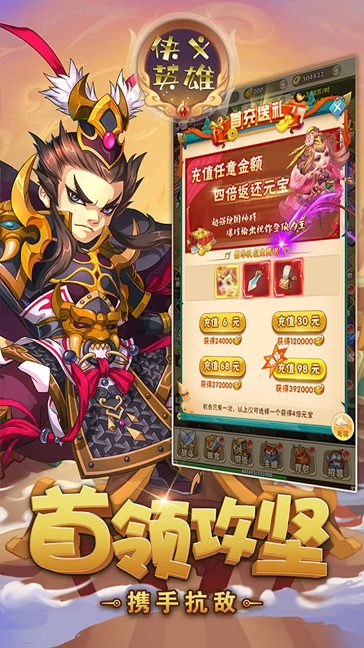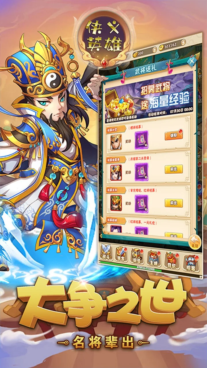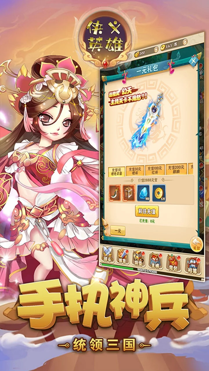 游戏采用淡水粉色调的古朴背景和Q版的人物角色造型。玩家不仅可以招募三国名将共同征战沙场,还可以烧脑策略组团打BOSS,攻城略地加冕称王,个性化的武将养成、多种副本玩法和PVP跨服PK,再现三国战场。