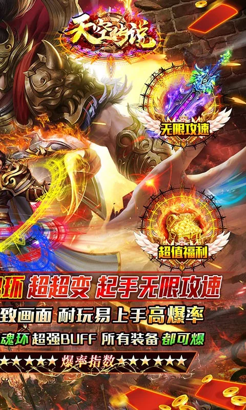 天空传说(魂环秒爆充)是一款超攻速的特色魂环复古传奇手游,游戏内炫酷的技能打击感以及专属魂技将带来超爽的爆装体验。上线送真充、在线领炫酷称号、杀怪赠海量货币,超多福利、全新五大陆助力传奇新体验。热血重燃,激情再续,历尽千帆,归来依是少年!