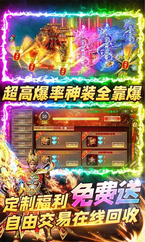 《烈焰封神(送黑龙刷充)》是一款角色扮演传承经典玩法的传奇手游,游戏内加入全新的GM打金工具,在线挂机打BOSS即可爆取大量GM卡代替RMB充值,以打代充。开局就送VIP20、万元红包、一亿绑金,GM商城统统1钻石0元购,更有版本专属破解修改器!资源无限自助兑换!真打金传奇是兄弟你就来!!