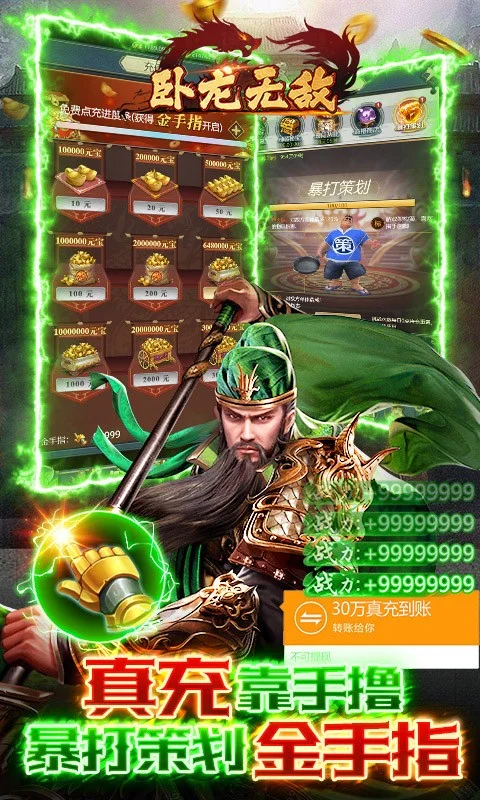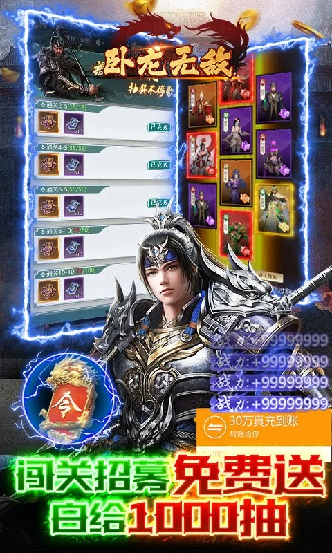 《卧龙无敌》是一款极具策略性的放置卡牌游戏,单身10年策划,真人还原入驻,为手速党精心策划5秒真男人福利玩法!暴打策划获得金手指道具,免费充值点到手软!闯关,挂机均可获得大量充值卡碎片,不花钱免费合成千元真充卡!多日累充!每日累充!VIP!统统免费激活,活动免费白嫖!游戏还原经典三国场景以及数十个史诗级武将收集,全方位自由培养,阵容搭配千变万化,合击技酷炫炸裂,十八般神兵齐出制胜全场,助力主公称霸天下,一统三国!新奇与经典完美融合,延续魏蜀吴群的传奇对决!