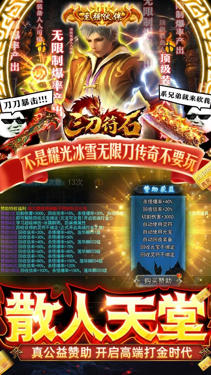 《三刀符石》拥有无限制等级,无限制攻速,无限制装备,无限制技能 ,无限制爆率产出,完美继承复古经典传奇玩法,上千件装备,无限爆率,人人都可获得顶级装备,人人都可自由发展无限制淦服!传奇不死,情义不散!是兄弟就一起来《三刀符石》,尽情挥洒基情岁月 !