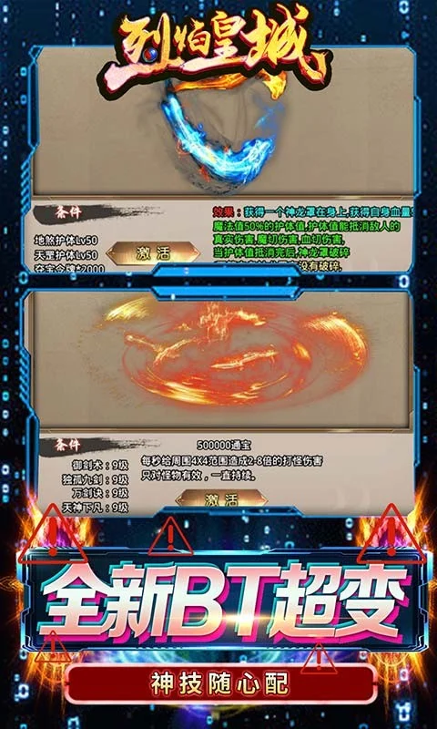 烈焰皇城(GM魂环超变)是一款打金超变传奇,GM送扶持每日海量真充,玩的越久送的越多,会员无需充值,完成任务免费激活,零氪一样爽!游戏内百种BUFF,多种至强绝技超爽超BT!游戏内独创副职专精玩法:血色骑士、暗夜刺客、近战法师,随心搭配,玩出独一无二的传奇!!!
