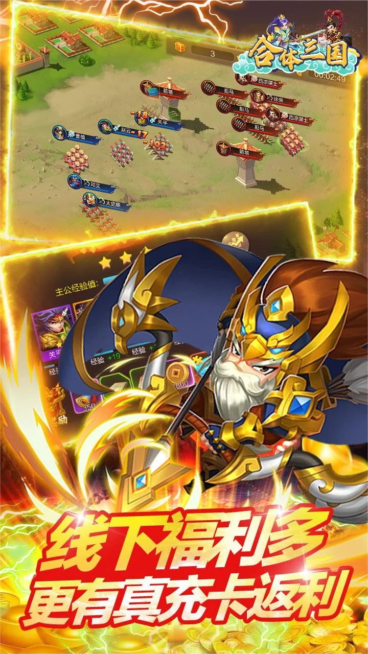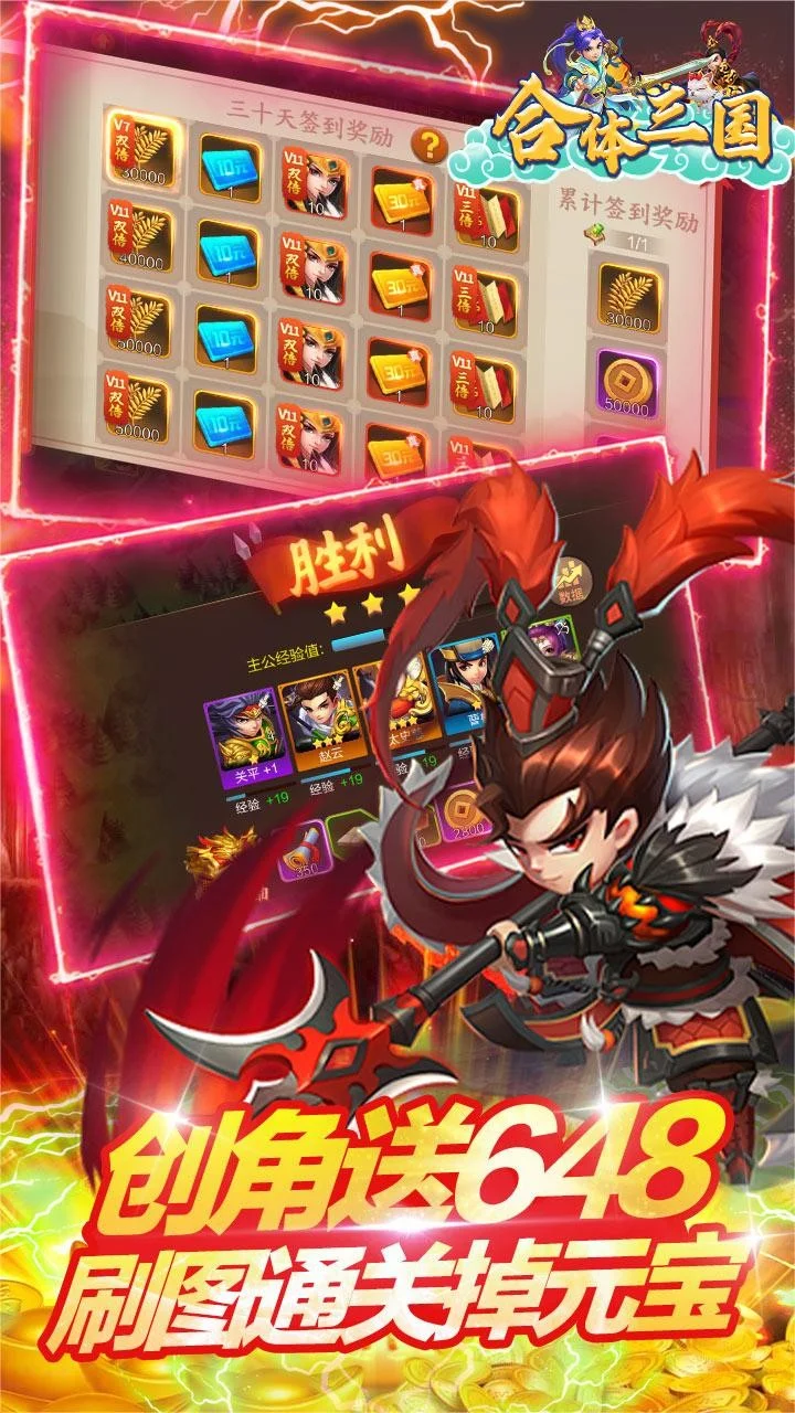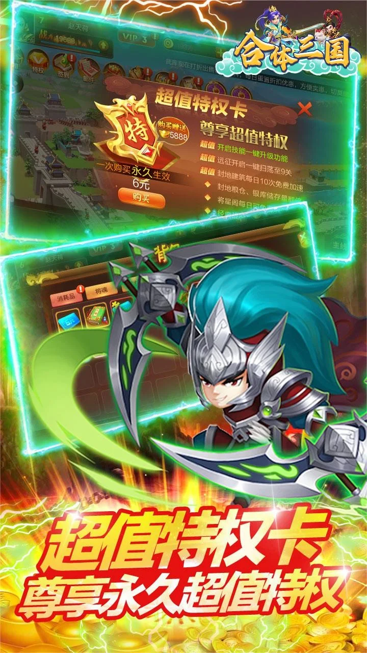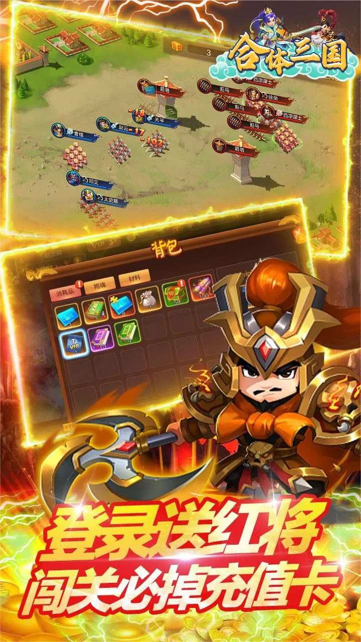 《合体三国》是一款以三国战争为题材,萌系画风的卡牌SLG手游。在传统卡牌回合对战的基础上,游戏内加入了个性化主角,首创休闲和战斗结合的挂机玩法,解放双手,照样飞速升级。流畅的动作,绚丽的画面,必将为您带来颠覆性的游戏体验!