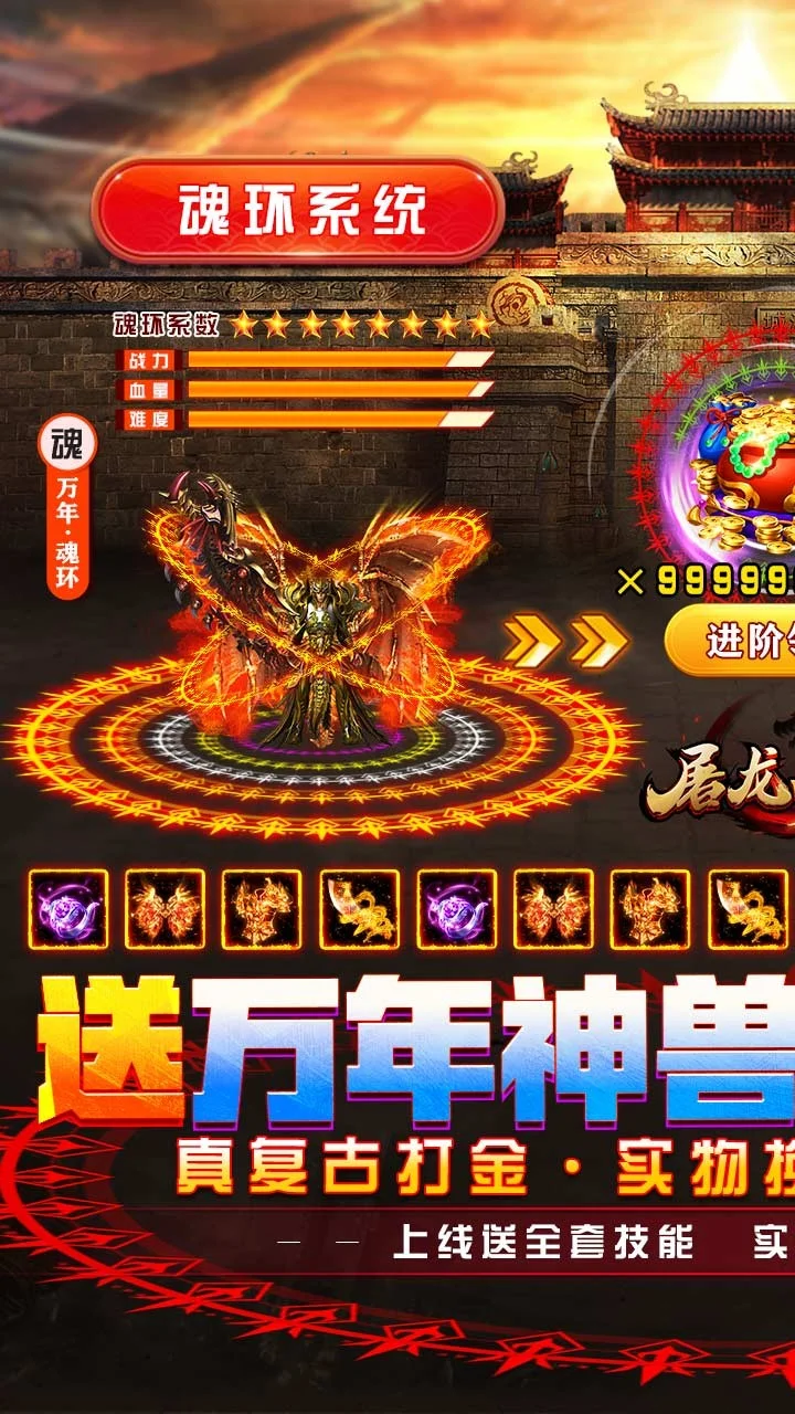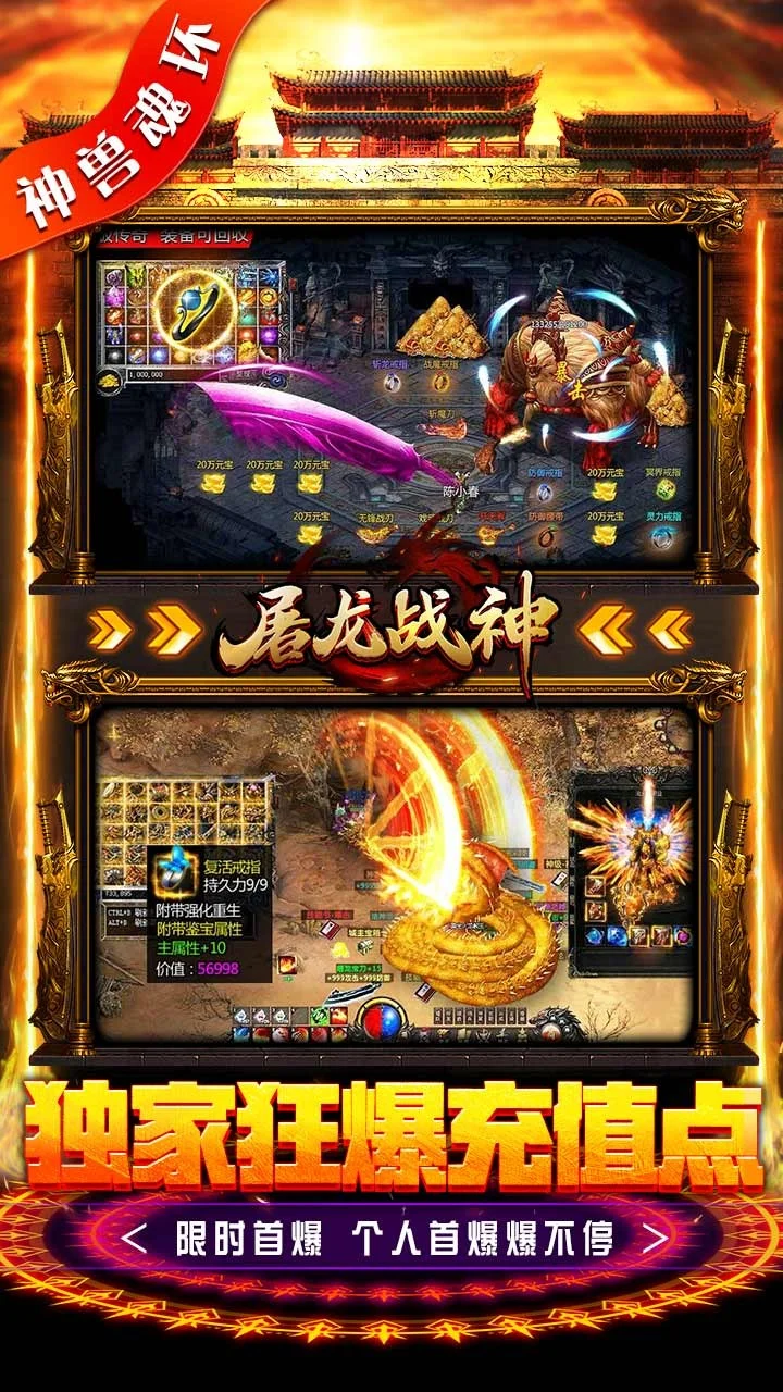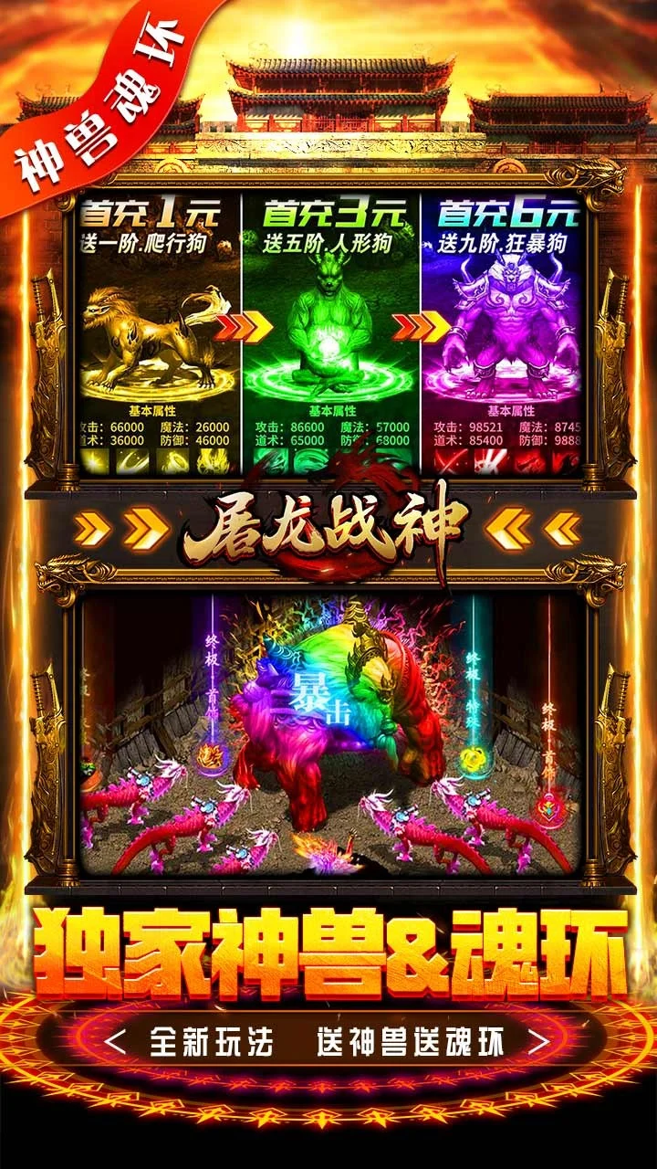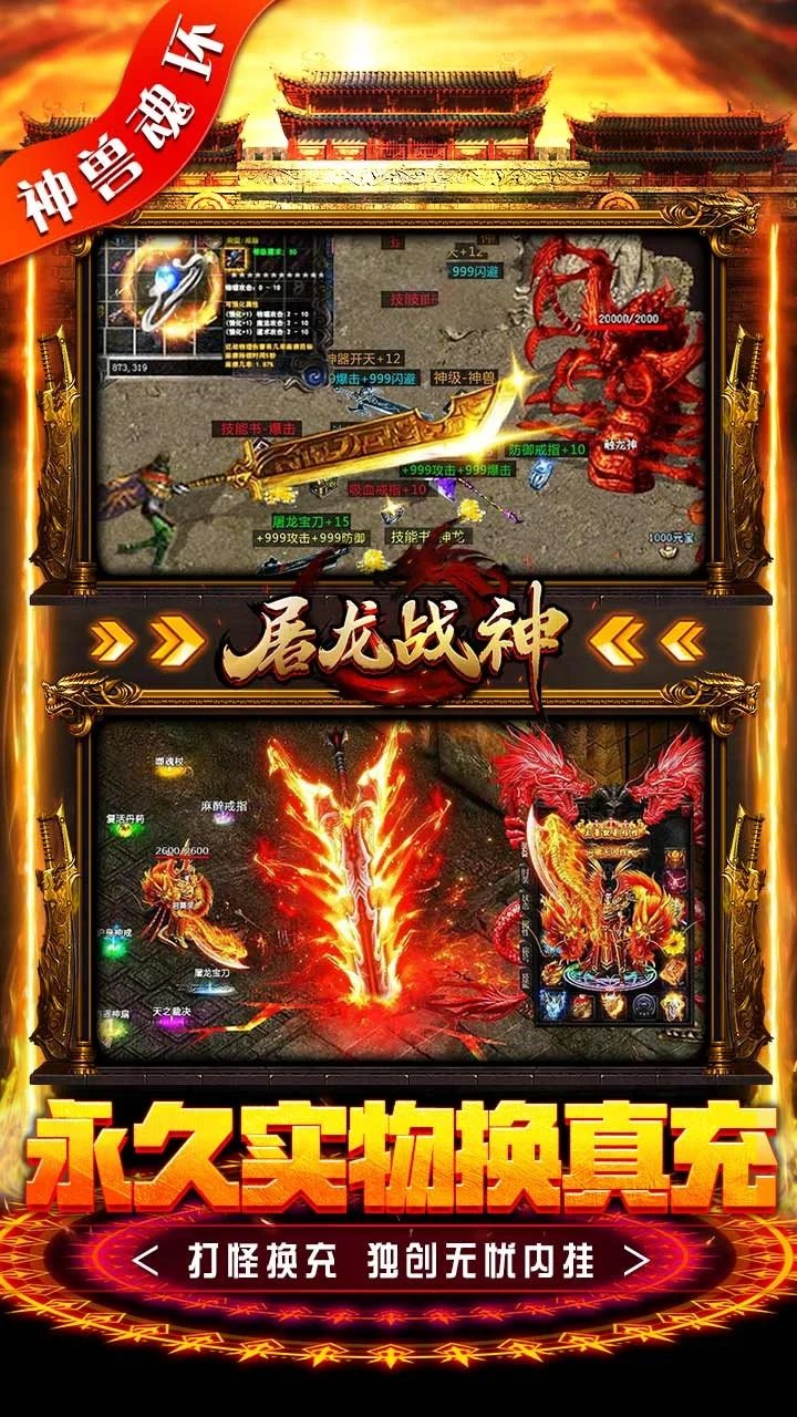屠龙战神(首款神兽魂环)携神兽&魂环双系统,优质内挂系统革新上线! 创角即送终极技能、刀刀红绿毒、极品材料豪华大礼包,海量元宝,材料,实物盲盒每日登录送!独家神兽、魂环双系统均可免费获取,海量充值点限时首爆、个人首爆爆不停! 永久实物换真充,任意小怪均可掉落,玩传奇就是要爽!还有独创的优质内挂系统,特色夜间挂机机制,自动巡航,自动下图,挂机无忧!