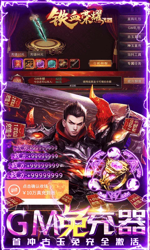 《铁血荣耀》是一款角色扮演类传奇福利版手游,来玩就送GM海克斯科技工具,通过挂机刷BOSS超高概率掉落黑金卡,可在GM后台福利玩法中直接代替RMB充值指定内容,无需充值一直刷一直爽!!