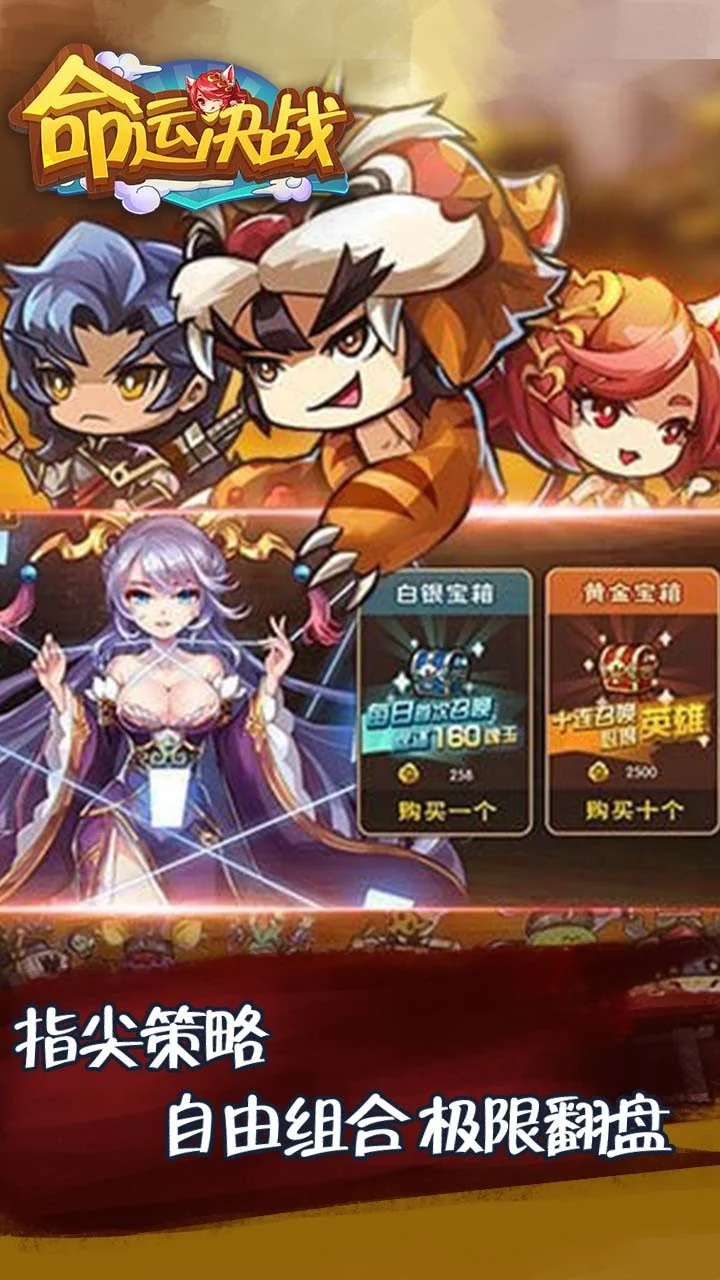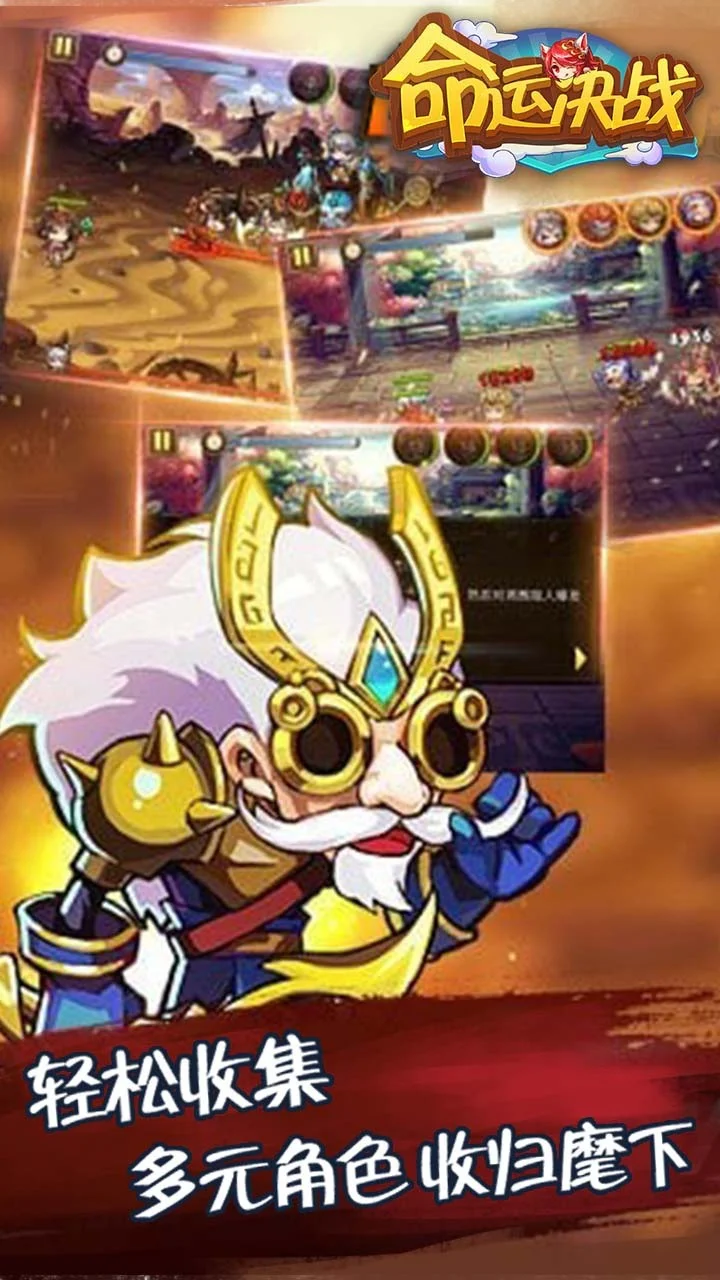 《命运决战》震撼公测!华丽画风,名将云集!炫酷技能,热血战斗!这是一款横版动作战斗卡牌,酷炫技能大招,爽快战斗体验,多样武将养成,丰富阵容搭配,福利多多,元宝多多,战力蹭蹭往上涨!带给你前所未有的卡牌乐趣! 一句话介绍:Q萌画风,全新横版动作战斗卡牌!
