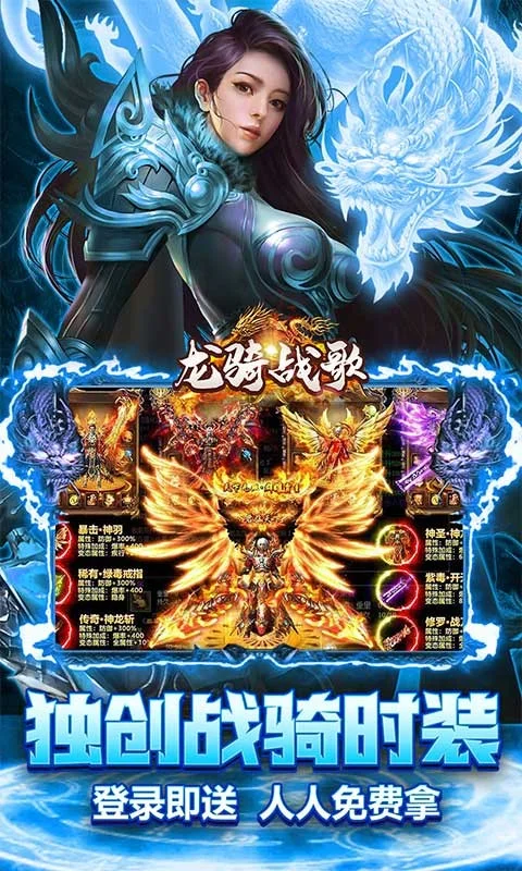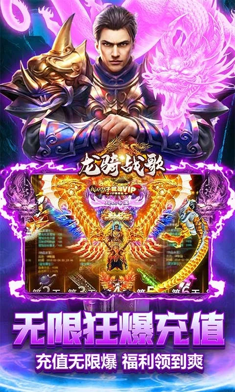 龙骑战歌(养龙打金版)独家养龙版本,上线送金龙,超炫酷外观+超强属性狂虐BOSS,独家全屏切割,特效满屏,独有寻龙宝藏,寻龙分金看缠山一重缠是一重关口诀是关门如有八重险,不出阴阳八卦形,升级奖励和击杀BOSS都可以获得寻龙宝藏超多奖励,领到手软!专属骑战时装,霸气无双,打怪无限爆充值,散人一样爽~