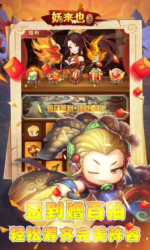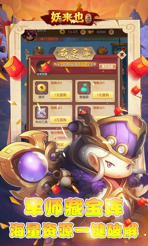 《妖来也(BUG三国黑科技)》是一款三国卡牌手游,经典6v6,体验各时代英雄集结的力量,统率三军征战四方,一统乱世!通过对自身武将的培养,装备,升级等一系列增加战斗力物品的收集,在不同的对局中,派出不同的阵容进行对战,充分发挥玩家的谋略,拥有不一样的游戏体验!还能利用黑科技进行刷充,还在等什么?快和三国猛将一起闯天下吧!