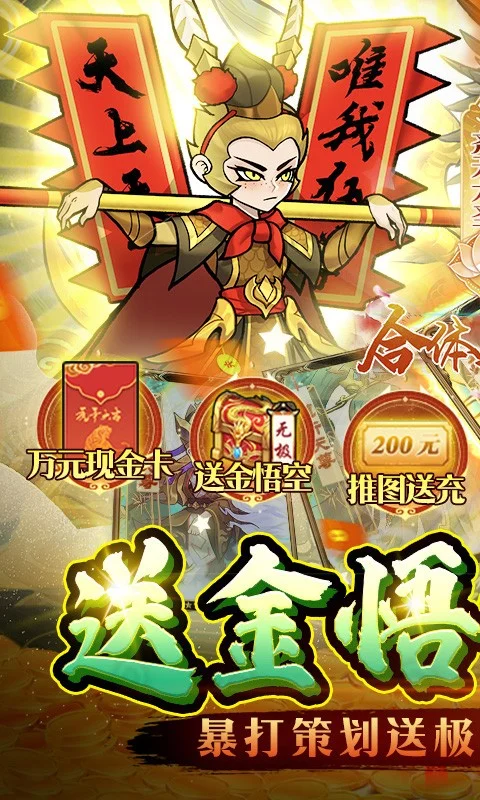 《合体三国》是一款以封神神话为背景的卡牌策略类手游。来玩就送金仙孙悟空,还能觉醒到金色孙悟空!每日登录可获得10000元现金卡!推图领真充,一直推一直送!开局即送万充百抽大礼包!游戏以神话武将收集为主线,通过对武将的培养形成核心战斗力,从而逐步参与和突破其他的玩法。游戏玩法融入爬塔、日常副本等玩法,经典完美传承,历史策略卡牌情怀再续!通过玩游戏能获得经营策略思维的锻炼,体验胜利的乐趣