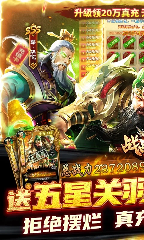 2023全新版本三国卡牌来袭,福利超级加倍,剧情神还原,让你体验最原滋原味的三国。创角就送200万元宝,升级还能领取20万红包,真充卡能激活线下永久累充活动,而且还能解锁全部GM商城!全新玩法无限分元宝,轻轻松松百亿元宝到手,一波直接财富自由!登录签到免费领取海量福利,五星关羽轻松到手,享受战力狂飙的感觉!男儿带吴钩,招兵买马、征战四方,带领众多名将结交天下英雄,醒掌天下权,醉卧美人膝,一统天下功成名就。