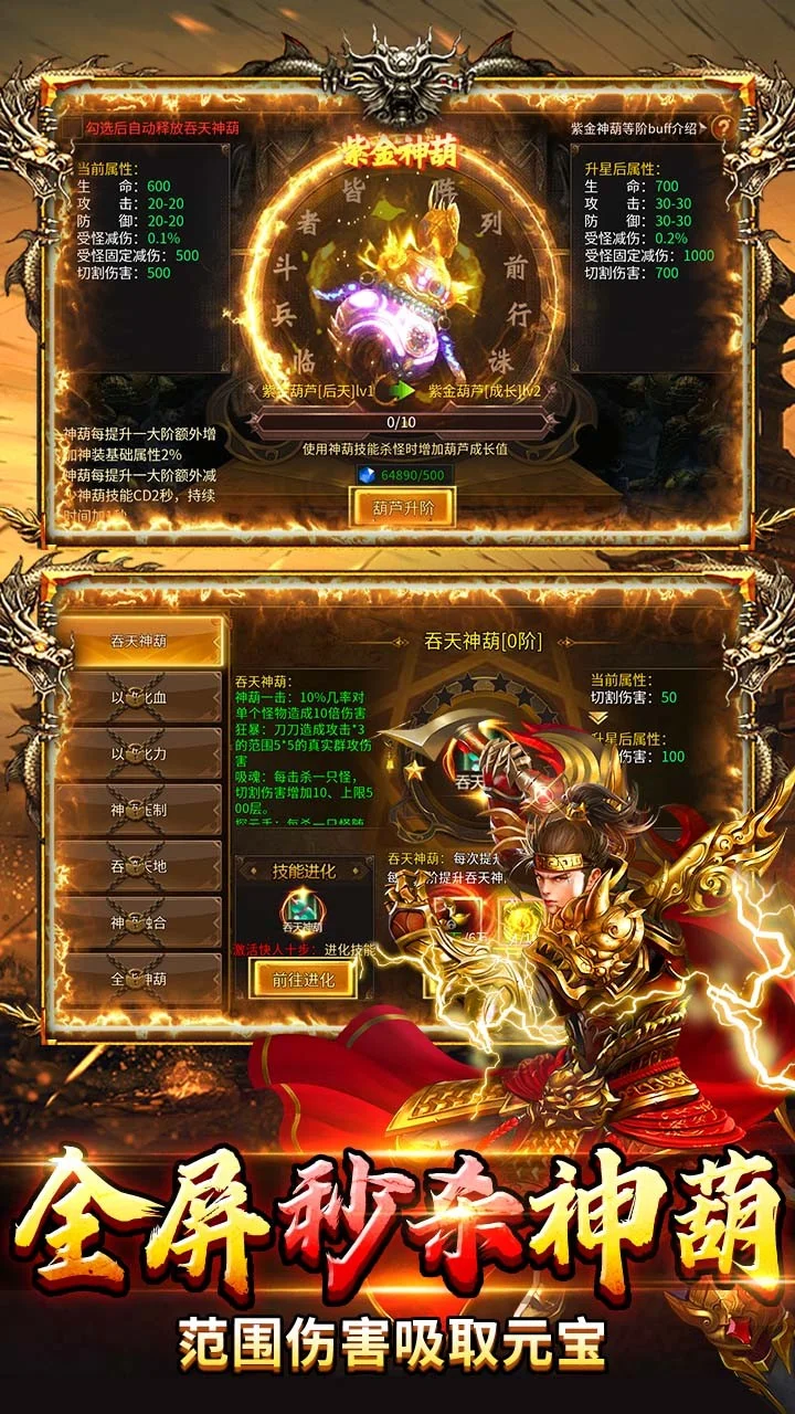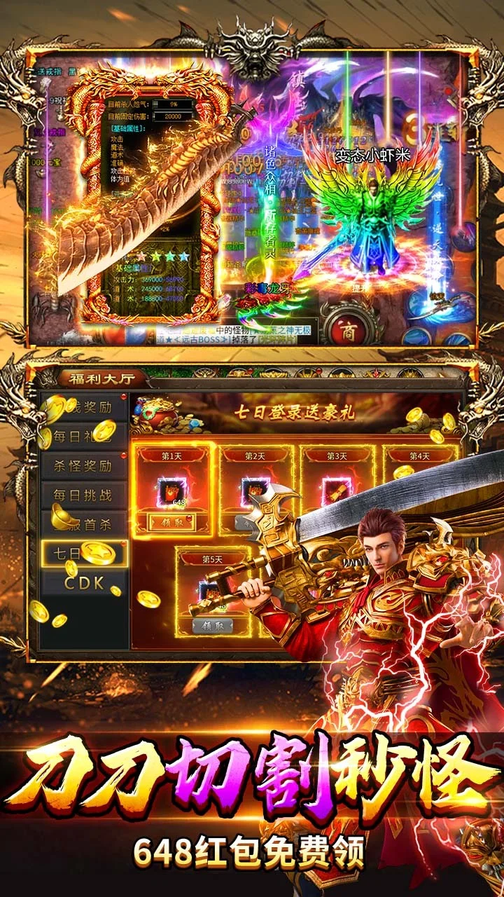 永久内置3折福利,开局免费赠送豪华首充,开局自动拾取、范围拾取、刀刀绿毒、刀刀切割,每天登录、在线、打BOSS均可领取海量红包。游戏玩法多样,养成神器神葫全屏秒杀全屏切割,我们保留对传奇的初心不变,一切装备都可游戏产出,任何货币都可游戏产出。只要你肯花时间,就可以吊打一切!