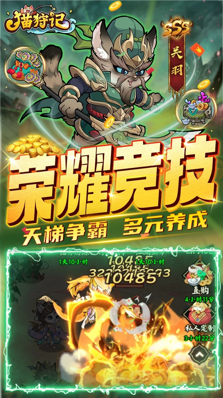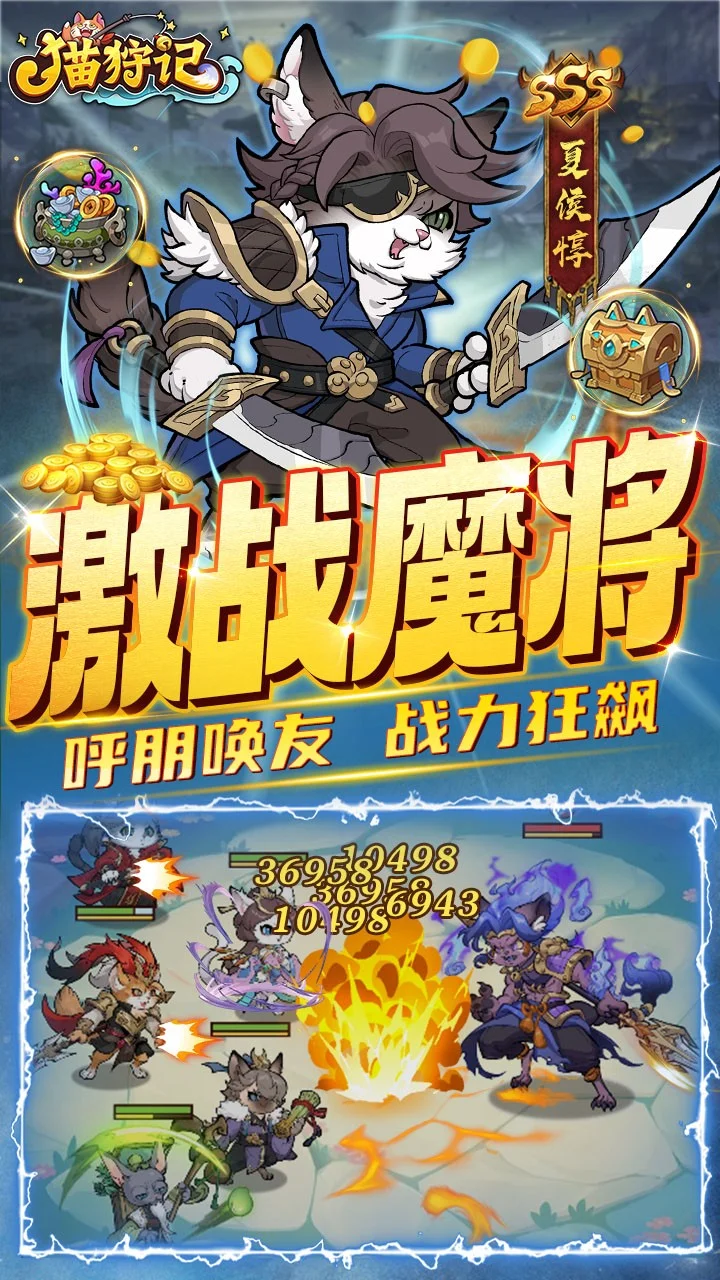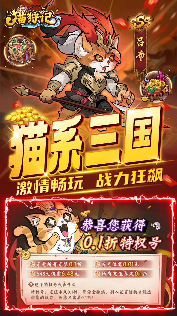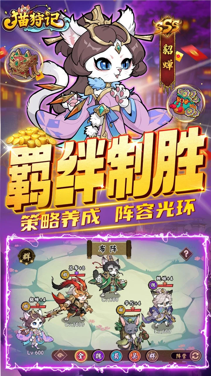全新三国萌猫放置卡牌《猫狩纪》正式上线!在这个游戏里你可以邂逅来自不同势力背景的猫将英雄,组建属于你的阵容征战四方,称霸三国,书写你的热血传奇! 游戏特色 【摸鱼首选】佛系放置挂机,自动推关解放双手,宝箱大量资源轻松养成 【策略百变】魏蜀吴群四大阵营,三国喵将自由搭配,感受策略对决魅力 【玩法多多】多种全新竞技玩法上线:全民封魔BOSS争夺、天梯竞技决胜负、三国鼎立定荣耀,闲时也能猫舍撸撸猫,感受岁月静好,给你永不枯燥的游戏体验