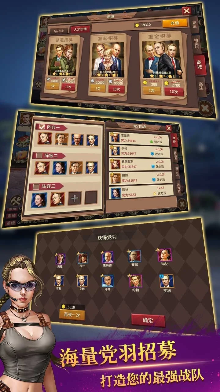 全民总统是一款回合制的权利RPG游戏。在全民总统中,玩家将成为一名争夺总统头衔的政客,参与到紧张刺激的权利斗争世界之中。游戏采用了写实又Q萌的人物形象,逼真可爱两不误。丰富的系统,多样的玩法,带来全新的rpg游戏体验。