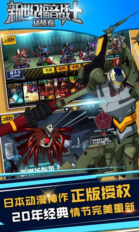 《新世纪福音战士适格者》是一款改编自经典日本同名动漫的机甲类战士战斗RPG游戏,经典人物剧情华丽再现,震撼级3D视觉效果和刺激音效,宏观的游戏世界及角色设定,丰富武器强化系统,超强打击感,更多刺激精彩呈现!玩家在游戏中将扮演一位刚到NERV日本总部的新人指挥官,肩负着开发EVA机体、训练驾驶员、迎击使徒等等重要的任务。游戏的战斗、养成系统里使用的元素都是大家相当熟悉的EVA要素,比如同步率、暴走等等。