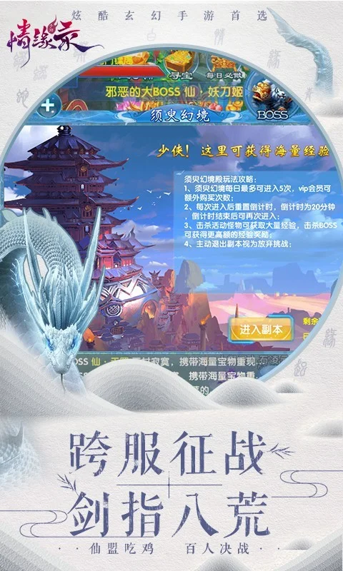 采用流畅的即时战斗模式,丰富的剧情、独特的修仙风格、无敌仙侣、霸气法宝、炫酷神兵等,上线即送超萌坐骑,登录领取超强神器仙装、绝版背饰,海量银两道具显示获取,千人同屏,激战仙魔界!