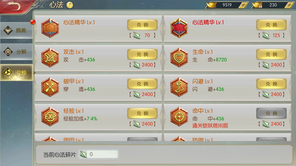 8.部分心法兑换需要通关相应层数的锁妖塔