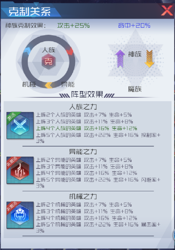 五大阵营互相克制,【人】克制【异能】,【异能】克制【机械】,【机械】克制【人】,【神】和【魔】互相克制,遇到克制的阵营,增加25%的攻击和20%的命中。