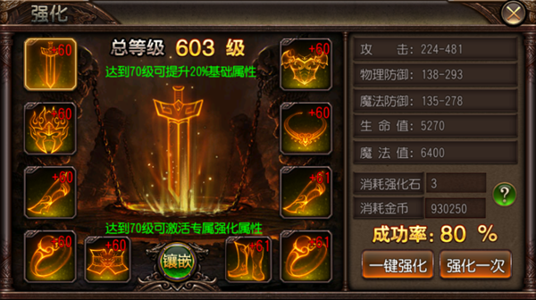 玩家可通过强化系统,来强化装备。在80级之前,玩家可用金币及强化石提升装备部位的强化等级,强化可永久提升玩家的各项属性。80级之前强化百分百成功,80级之后有一定概率失败。