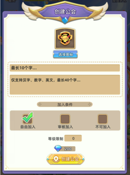 公会的创建需要花费200钻石。你可以设置公会图标、名字、公会公告、加入条件。