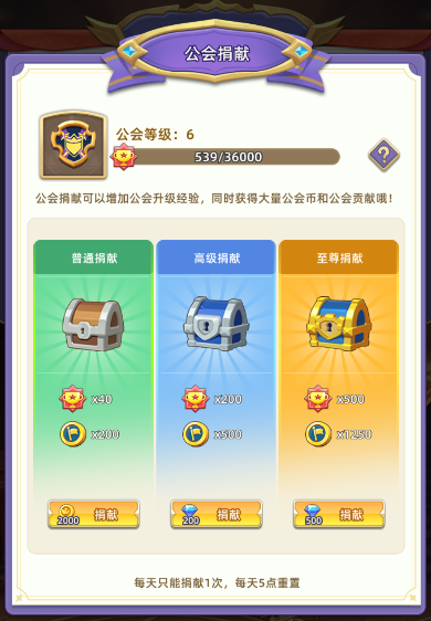 公会捐献可以增加公会升级经验,同时个人也能获得公会贡献和大量公会币。公会币可用于公会商店购买物品。