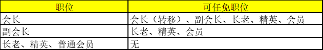 公会官职分:会长(1人)、副会长(1人)、长老(2人)、精英(5人)、普通会员。
