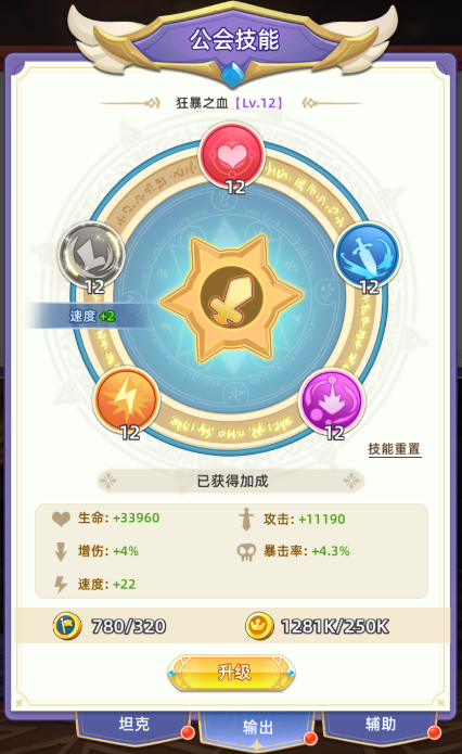 玩家通过升级公会技能,能让全队提供属性的加成。