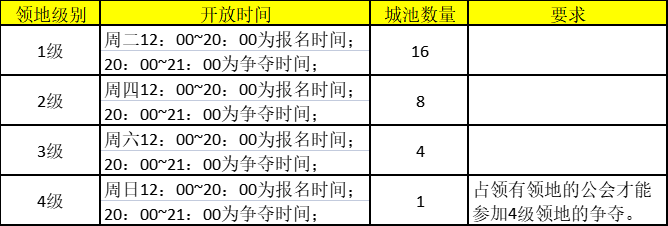 1、领地分4个级别。每个级别领地开放争夺时间如下: