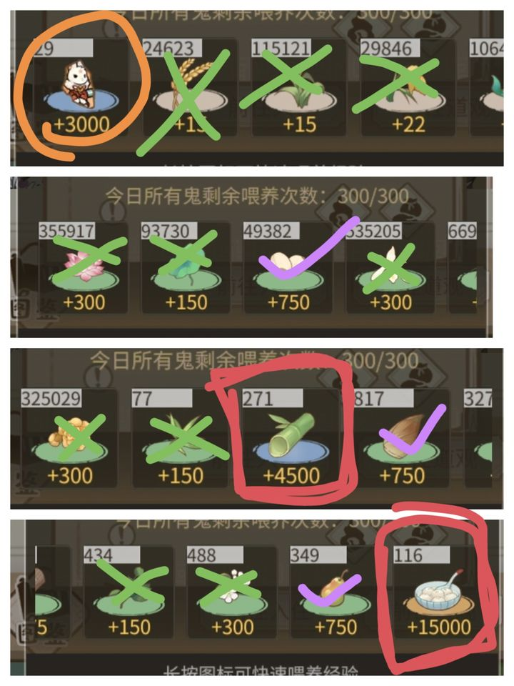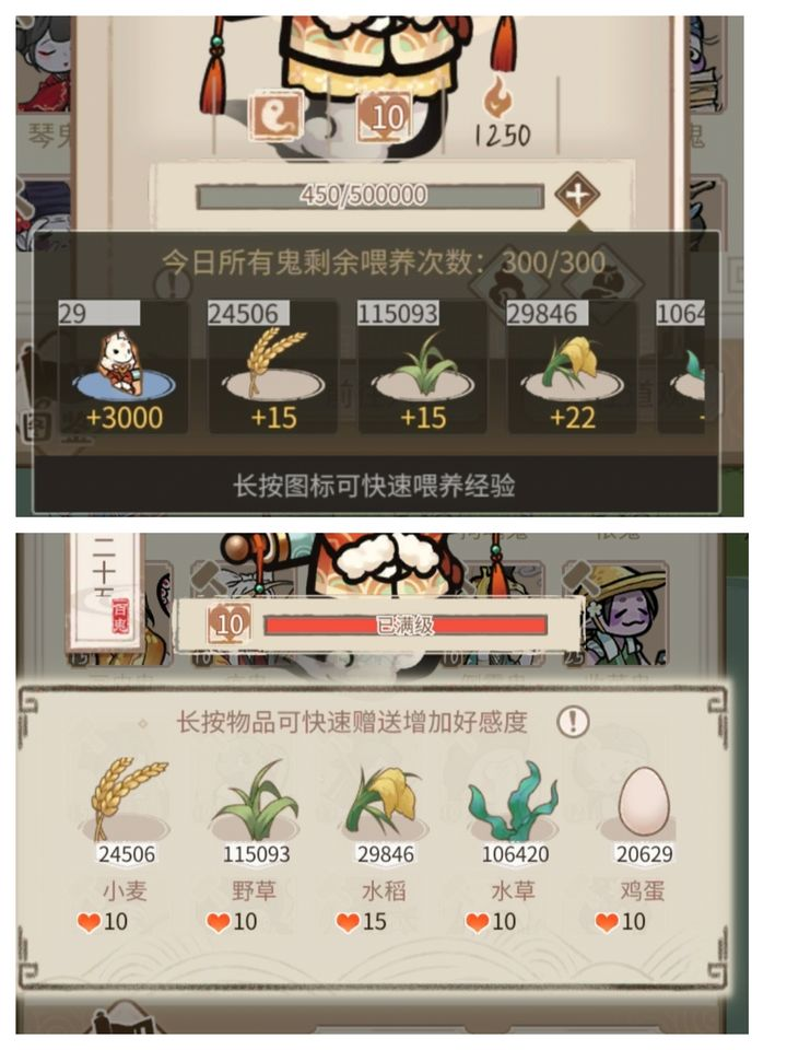 1. 在开始提升一个鬼的等级值之前,先要把好感度拉满(喂一些多余材料就可以了),建议喂猪粪,好感度可以加等级值送礼物的数值加50%,比如一个节日汤圆加1万经验,如果你好感度满值就是15000的经验,数值还是相当可观的。