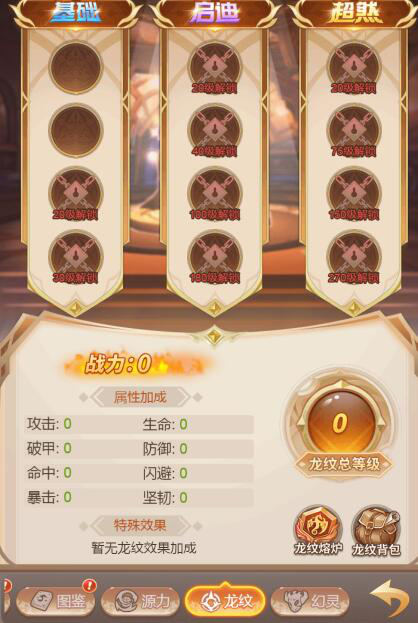 基础系槽位可以镶嵌所有系别的龙纹,龙纹升级到一定阶段后需要消耗碎片进行突破,突破后方能继续升级,所有已镶嵌的龙纹等级之和达到定数值后会解锁新的龙纹槽位。