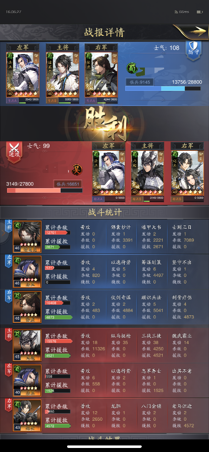 而蜀智队的内战就要考研两队的技能触发情况了,这时候一些黑科技也会起到不一样的效果,例如下图中胜利方的诸葛采用了三战三捷和八门金锁的武技搭配,单体伤害输出能力增强了很多,各位主公们在游戏中也可也尝试探索一下。