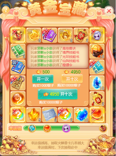 首先不能错过的是黄金宝藏,可以抽到紫色宠物鬼剑客和金色宠物火麒兽,每日都有一次免费抽取的机会,除此之外,还可以花费不绑定元宝和绑定元宝抽取。如果元宝不多的话,小编建议是使用绑定元宝比较划算,运气好的话,抽几次就能抽中紫色的宠物鬼剑客,如果欧气不足也不用担心,每抽一次就会加一点幸运值,待幸运值达到一定的要求,便可获得对应的物品奖励,当幸运条满的时候就会获得金色宠物火麒兽啦。如果元宝足够的情况下,小编建议第一次使用不绑定元宝十连抽,是必然会得到一张紫色宠物鬼剑客卡片的哦。