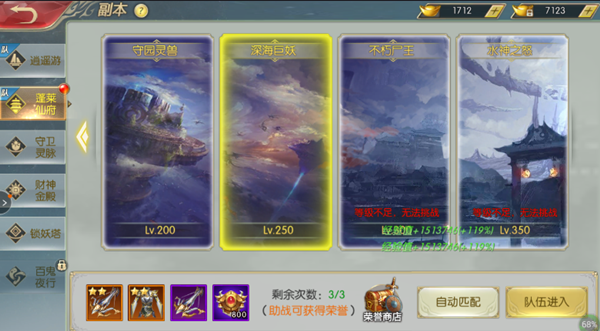 蓬莱仙府可以组队进入,也可以单人创建队伍进入哦。也许有玩家大大会有疑问,可以单人挑战的话为什么我要组队?因为会根据通关时间对副本进行评级,星级越高的掉落稀有道具的几率越高高高高啊