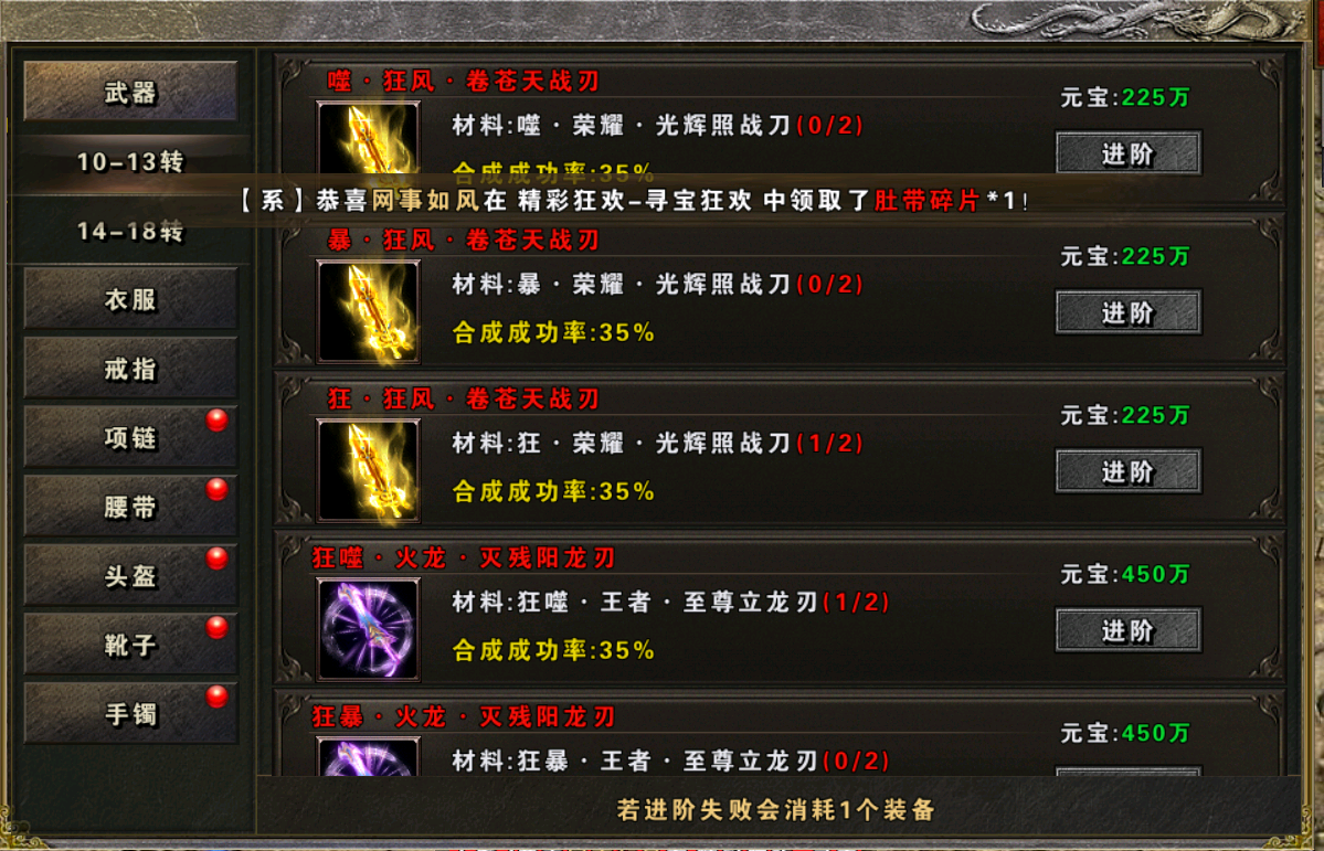 多出来的高阶装备不要急着回收,熔炼可产出稀有材料,熔炼的装备等级越高,获得的材料也越多。高阶装备可融合可进阶。可以在盟重城进行融合进阶。这些都是可以提升实力的小技巧。装备起来后在怪物攻城,血战沙城,跨服远征中游刃有余。