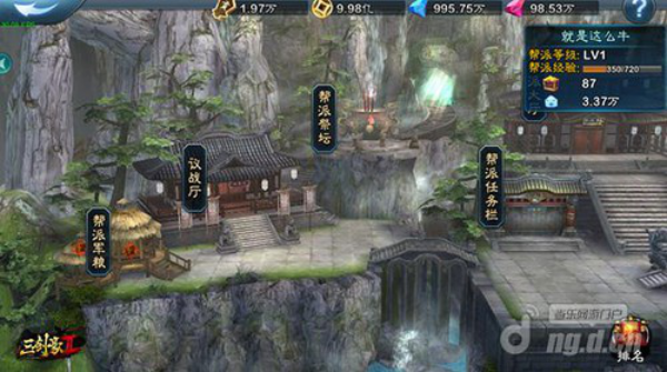 进入帮派界面后,向左拖动屏幕,移动到“议战厅”,并点击进入。(图为1.2.0版新帮派界面)